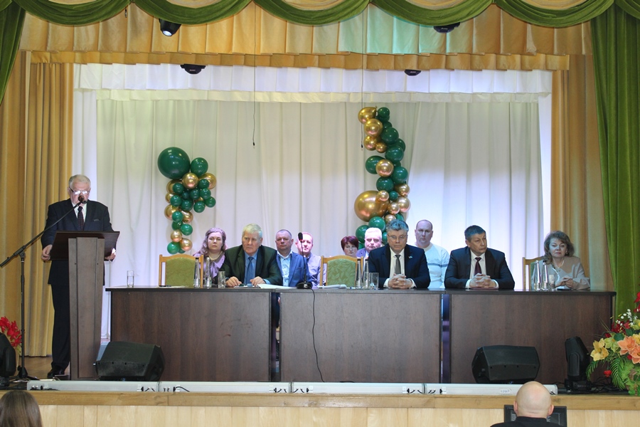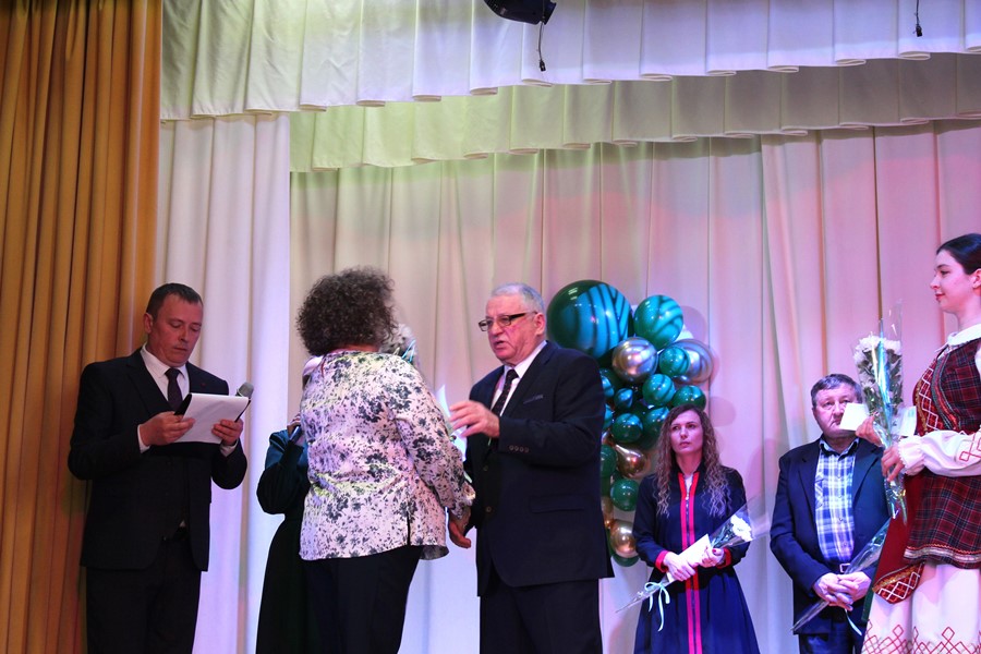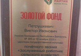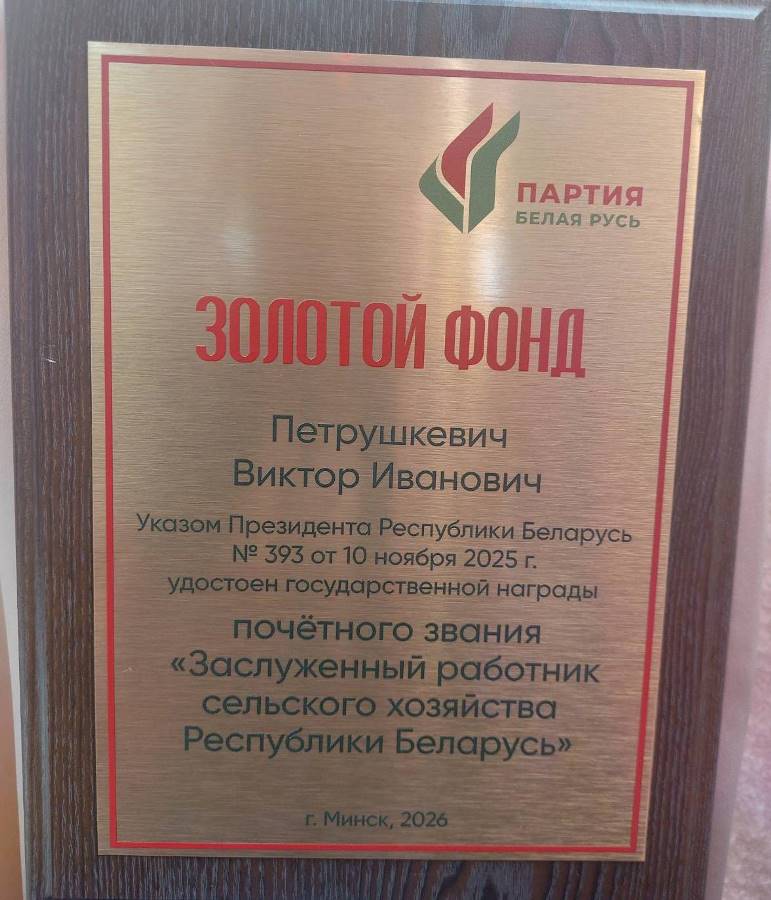 Поздравительная часть собрания началась с вручения нашему председателю Виктору Ивановичу Петрушкевичу Памятного знака «Золотой фонд» от партии «Белая Русь». Памятный знак вручается тем людям, которые внесли огромный вклад в развитие нашей страны, области, района. Указом Президента Республики Беларусь Виктор Иванович в 2025 году был удостоен почётного звания «Заслуженный работник сельского хозяйства Республики Беларусь».